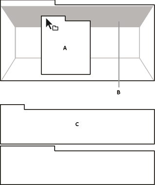 Andockbereiche befinden sich entlang der Ränder von Bedienfeldern, Gruppen oder Fenstern. Beim Andocken eines Bedienfelds wird das Bedienfeld neben der vorhandenen Gruppe eingefügt, wobei die Größe aller Gruppen entsprechend geändert wird, damit das neue Bedienfeld in den Bereich passt.