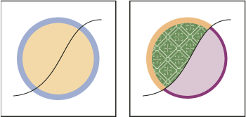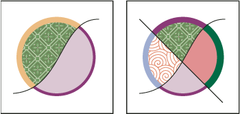 Por ejemplo, si conviertes un círculo con una línea dibujada a través de él en un grupo de Live Paint, la línea se convierte en un borde que divide el círculo en dos caras separadas. Puedes usar la herramienta Live Paint Bucket para rellenar cada cara y aplicar trazo a cada borde con un color diferente.