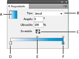 A. Relleno de degradado B. Menú de tipo de degradado C. Botón Inverso D. Inicio de etapa de color E. Punto medio F. Color final del degradado