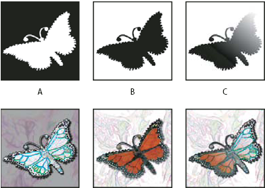 Maskit tallentuvat alfakanaviin. Maskit ja kanavat ovat harmaasävykuvia, joten voit muokata niitä samalla tavoin kuin muitakin kuvia käyttämällä maalaustyökaluja, muokkaustyökaluja ja suotimia. Maskin mustalla maalatut alueet ovat suojattuja ja valkoisella maalatut alueet muokattavia.