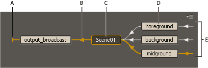Pendant le rendu, les données de l’image et les autres informations s’écoulent en quelque sorte de chaque composition imbriquée vers la composition qui les contient. Pour cette raison, les compositions imbriquées sont parfois désignées comme étant en amont des compositions qui les contiennent. Les compositions réceptrices sont situées en aval des compositions imbriquées. L’ensemble des compositions associées par imbrication constitue un réseau de compositions. Vous pouvez parcourir un réseau de compositions à l’aide du navigateur de compositions et du mini-organigramme. En savoir plus sur l’ouverture des compositions imbriquées et la navigation dans celles-ci.
