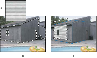 A. Motif copié d’un document séparé B. Image avec sélection (pour restreindre les résultats) créée dans Photoshop avant d’ouvrir Point de fuite C. Le motif collé dans Point de fuite est déplacé dans le plan et respecte la sélection