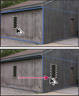 Dans Point de fuite, l’outil Tampon utilise des pixels prélevés. L’image dupliquée est orientée dans le sens de la perspective du plan de travail. L’outil Tampon est utile pour des opérations telles que la fusion et la retouche de zones d’une image, la duplication de portions d’une surface pour peindre un objet ou la duplication d’une partie d’une image pour dupliquer un objet ou étendre une texture ou un motif.
