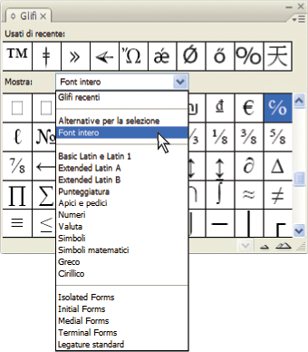 • Scegliete il set di glifi dall’elenco Mostra.