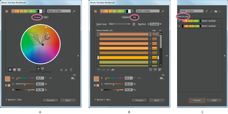 Hiçbir resim seçili değilken renk grubunu seçin ve ardından Renkleri Düzenle iletişim kutusunu açmak için Renkleri Düzenle seçeneğini belirleyin. Seçili renk grubunu düzenlemek ve düzenlemeleri seçili resme uygulamak için Renkleri Düzenle veya Uygula'yı seçin. |