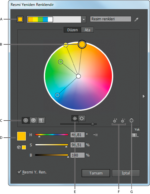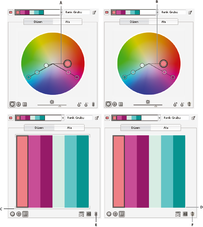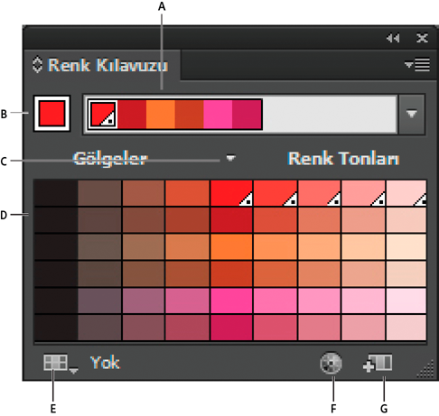 A. Uyum Kuralları menüsü ve etkin renk grubu B. Temel renk olarak ayarlama C. Birincil Renkler D. Renk çeşitlemeleri E. Renk örneği grubunu, renk örneği kitaplığındaki renklerle sınırlama F. Seçime bağlı olarak "Renkleri Düzenleme" ya da "Renkleri Düzenleme veya Uygulama" G. Renk grubunu Renk Örneği paneline kaydetme H. Renk çeşitlemeleri I. Renk Kılavuzu paneli menüsü