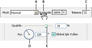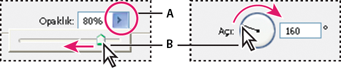 Bazı paneller, iletişim kutuları ve seçenekler çubukları, açılır kaydırıcılar kullanan ayarlar içerir (örneğin Katmanlar panelindeki Opaklık seçeneği). Metin kutusunun yanında bir üçgen varsa, üçgeni tıklatarak açılır sürgüyü etkinleştirebilirsiniz. İşaretçiyi ayarın yanındaki üçgenin üzerine getirin, fare düğmesini basılı tutun ve sürgüyü ya da açı yarıçapını istenen değere sürükleyin. Sürgü kutusunu kapatmak için sürgü kutusunun dışını tıklatın veya Enter tuşuna basın. Değişiklikleri iptal etmek için Esc tuşuna basın.