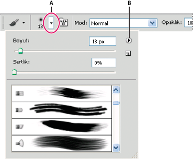 Açılır panelini görüntülemek için seçenekler çubuğunda bir araç minik resmini tıklatın. Açılır paneldeki bir öğeyi seçmek için tıklatın.