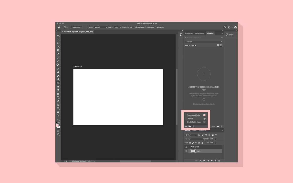 With the Capture in-app extension in Photoshop, quickly turn images from your document or your hard drive into a various design elements, such as color themes, patterns, vector shapes, and gradients. These are automatically saved to your libraries and instantly usable in your current project, or other Adobe applications.