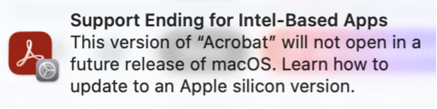 The warning may appear because some Acrobat features still use Intel-based components, which run under Rosetta. Acrobat continues to function normally, and no action is required.