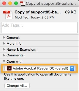 Click the triangle next to Open With, and choose Adobe Acrobat Reader or Adobe Acrobat from the pop-up list (if your preference is not on the list, choose Other to select it).