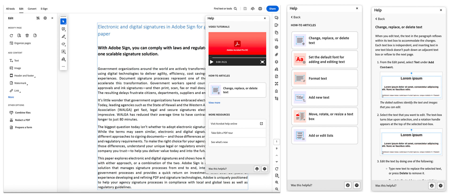 This release enhances in-app help with a comprehensive, integrated help section. The feature previously covered Edit and Request e-signature tools now extends to Export a PDF, Create a PDF, Combine files, Organize pages, and Fill & Sign tools. Within this section, you'll find:
