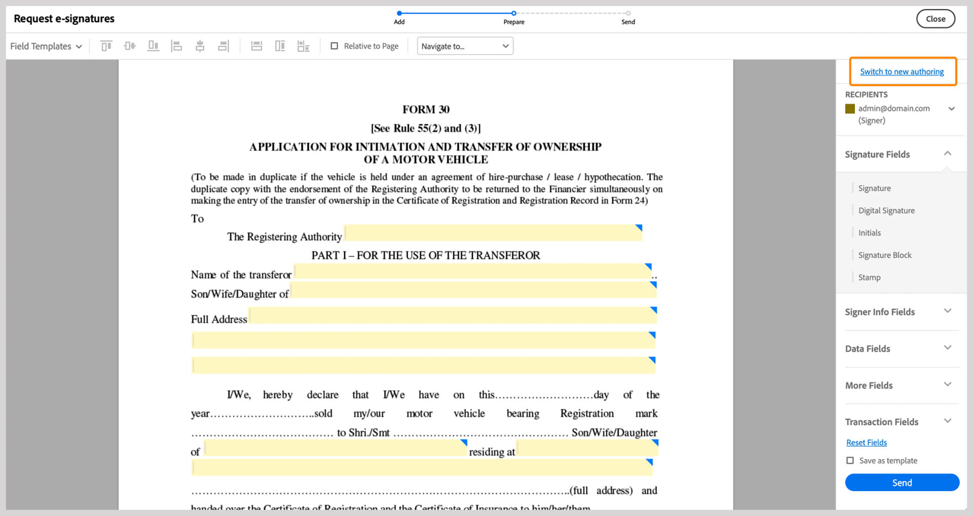 The agreement opens in the legacy authoring mode. To get back to the new experience, select Switch to new authoring.