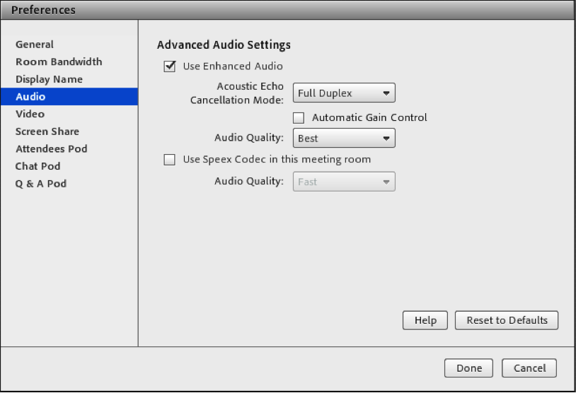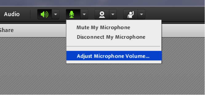 Adobe Connect application offers basic audio controls. For more advanced audio enhancement functions, Adobe recommends that you use the Adobe Connect Meeting application. Install when you are promoted to the role of Host or Presenter and intend to share a document or your screen with meeting participants. Among other things, the Meeting application provides enhanced audio features and controls, such as echo cancelation and automatic microphone gain control.