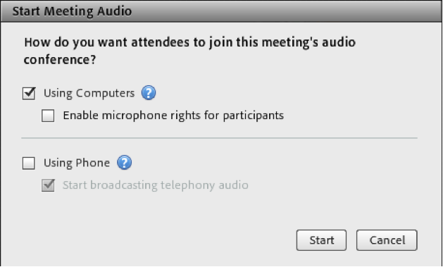To broadcast audio, first enable audio in the meeting room. In the menu, select Audio > Start Meeting Audio... Then, in the Start Meeting Audio dialog, select how you want to enable Audio in your room.