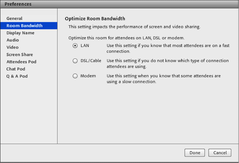 As the meeting host, you can set Meeting Room Bandwidth to determine the speed (kilobits/second) at which data from the meeting is sent to attendees. Choose a room bandwidth that matches the connection speed the attendees use. If attendees are using variuos connection speeds, choose the lowest speed that attendees can be using. For example, if some attendees are using modems, choose Modem for room bandwidth to ensure that all attendees have a good connection and client computers are not overloaded. Adobe Connect automatically sacrifices audio quality to minimize audio drops or latency for attendees on low-bandwidth connections. Properly setting room bandwidth helps Adobe Connect understand how to best balance performance and quality with bandwidth. Improperly setting room bandwidth often times results in dropped audio because the meeting is sending over more information than an attendee's computer can handle.