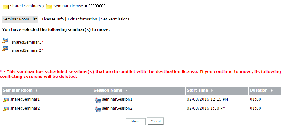 If there is a conflict in the existing session of the room and the license it is being moved, the user will be prompted with a warning and the list of conflicting sessions. The user may choose to proceed in which case the conflicting sessions of the source seminar license will be deleted.