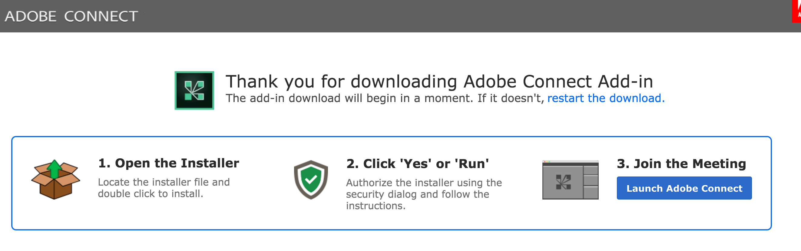 Users will be required to download and install this add-in and then re-enter the session. The download and install will be a one-time activity only for the user, this add-in will be launched whenever the user enters an Adobe Connect session.