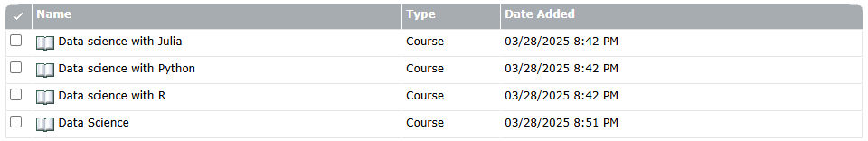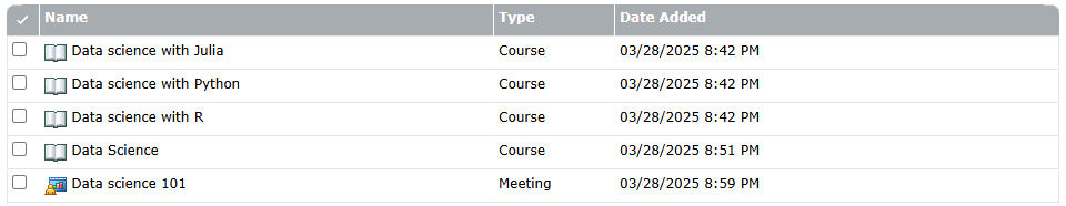 You can add content from the Content library, a meeting from the Meeting library, a virtual classroom, or any existing courses to a curriculum. Content added to a curriculum is now automatically converted to a course so it can be tracked accurately. The new course is added to the automatically created curriculum resource folder. (This folder is in the same location as the curriculum and has the same name as the curriculum with “Resources” appended to the end.)