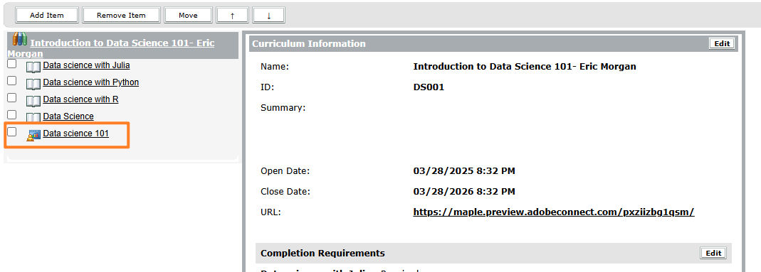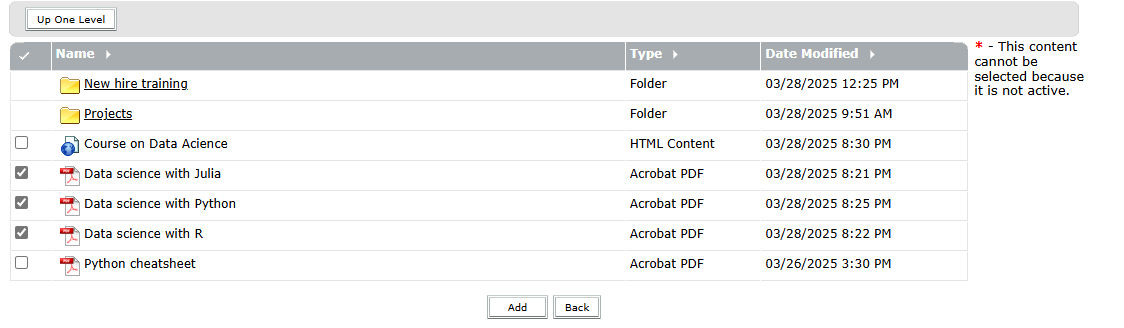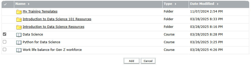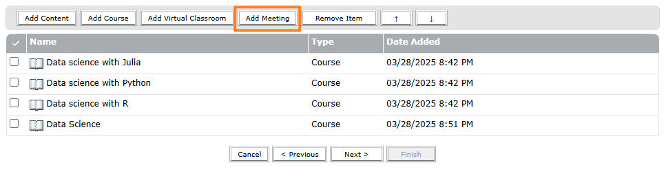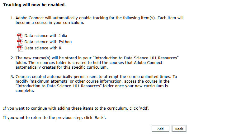 Select Add. Adobe Connect enables tracking of the items which get added to the curriculum.