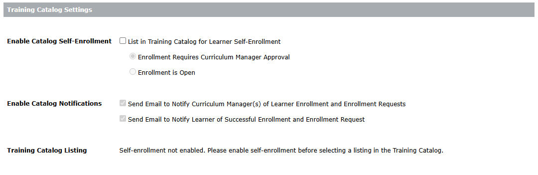Training Catalog Settings interface Training Catalog Settings interface - Enable Catalog Self-Enrollment: Catalog Self-Enrollment allows learners to enroll themselves into courses or curriculums directly from the Training Catalog without needing to be manually assigned by a training manager. There are two modes of self-enrollment:
