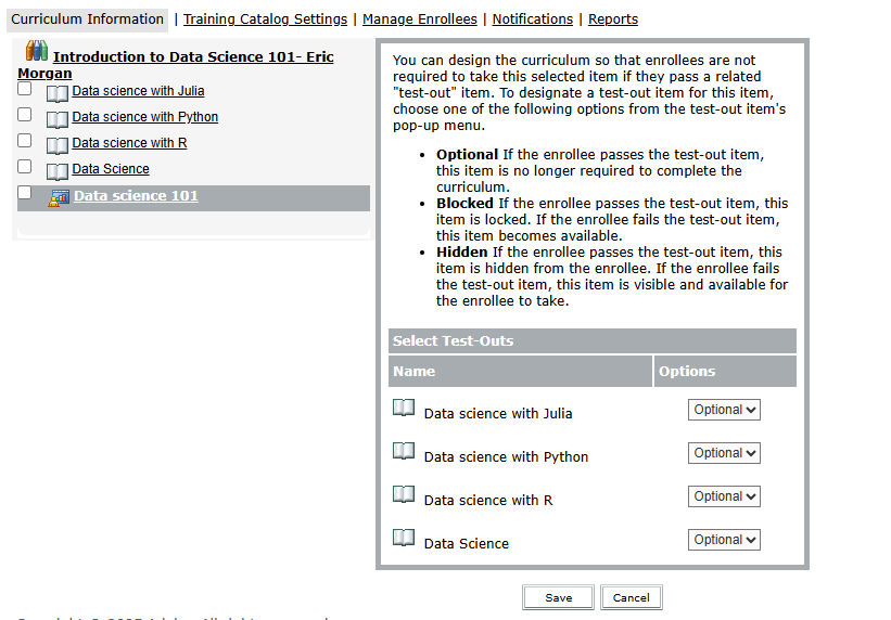 - Optional: Indicates that if the enrollee passes the test-out item, the selected item is no longer required to complete the curriculum.