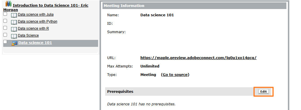Select Edit in the Prerequisites section of the course.