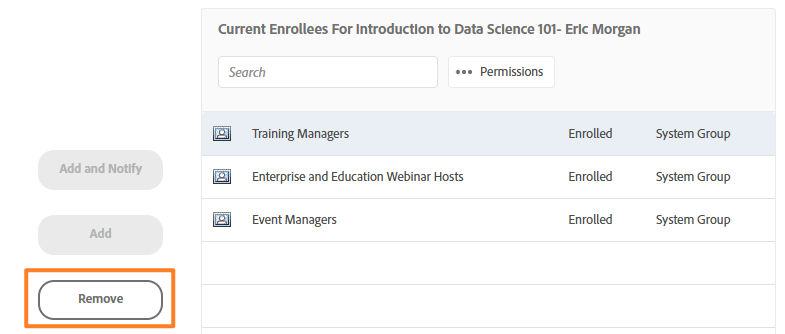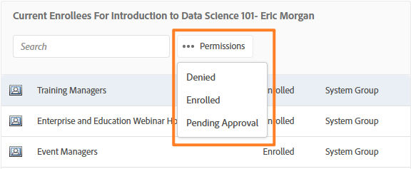 Select the enrollee or enrolled group in the Current Enrollees column and select Permissions.