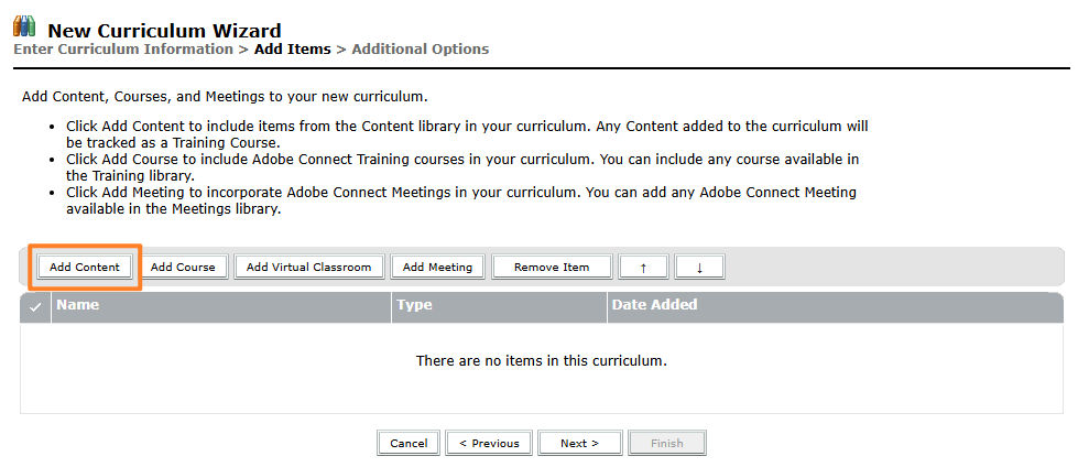 New Curriculum Wizard showing the option to add content to the curriculum New Curriculum Wizard showing the option to add content to the curriculum -