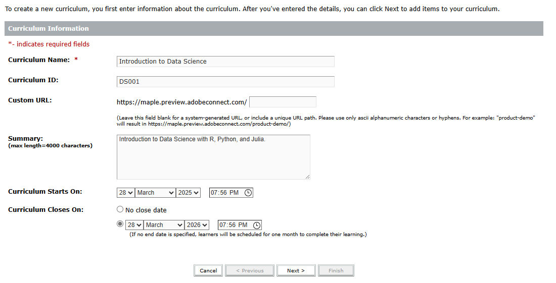 - Curriculum Starts On: The date on which the curriculum starts. Users cannot access the curriculum before this date.