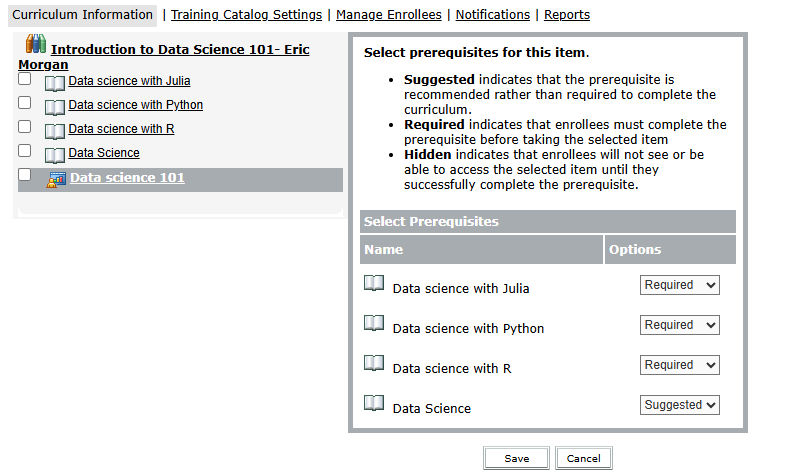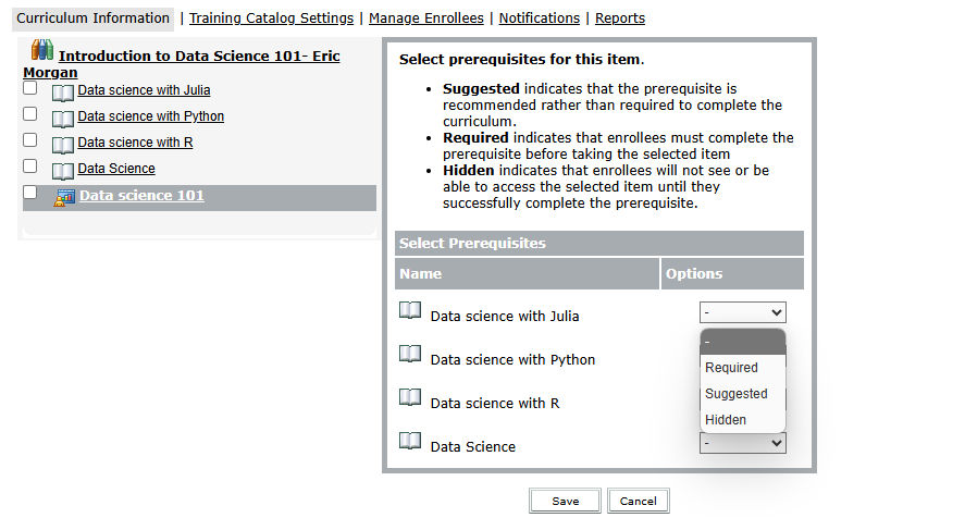 - Suggested: Indicates that the prerequisite is optional. Users receive a message requesting that they take the prerequisite before taking the selected item.