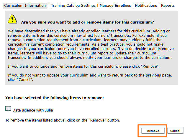 Delete content and courses from a curriculum after a curriculum is created. Adobe recommends minimizing the addition and deletion of courses and content after a curriculum is made available to learners. Communicate with learners enrolled in the curriculum. Tell them when content and courses are added or deleted and ask them to log in to the curriculum so their status updates.