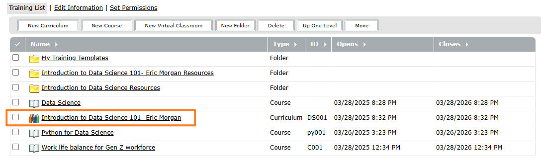 Select the Training tab and browse to the curriculum. Select the curriculum name to open the Curriculum Information page.