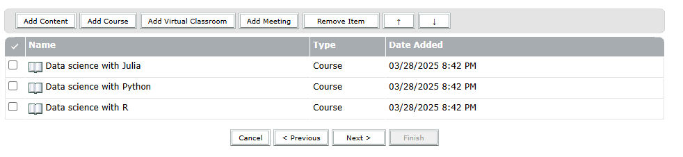 - Grouping related learning content: Combine courses, presentations, and meetings into a single program.