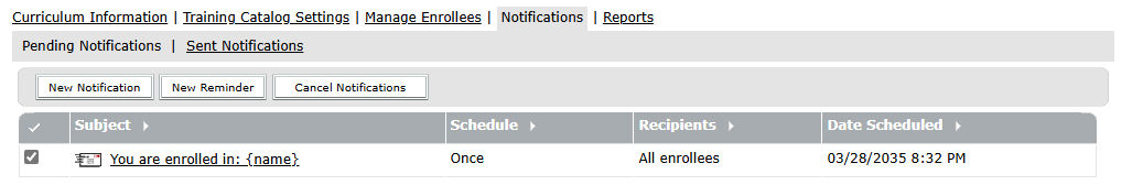 You can use the notifications feature to send an email message to enrollees. A typical message tells enrollee that the curriculum is available, provides details about the curriculum, and includes a link to the curriculum. The message can go to all enrollees, or to a subset of enrollees, such as those who have not completed the curriculum.