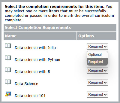 Select the completion requirements for the curriculum items. You can select one or more items that must be successfully completed or passed to mark the overall curriculum complete.