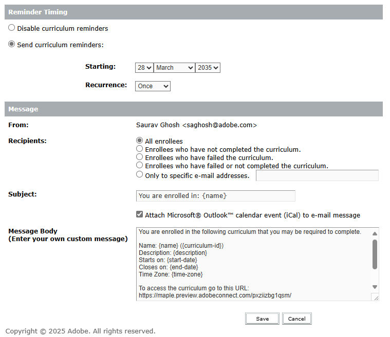 - Enable Catalog Notifications: When enabled, Adobe Connect automatically sends email notifications to inform users about enrollment activities related to courses or curriculums listed in the Training Catalog.