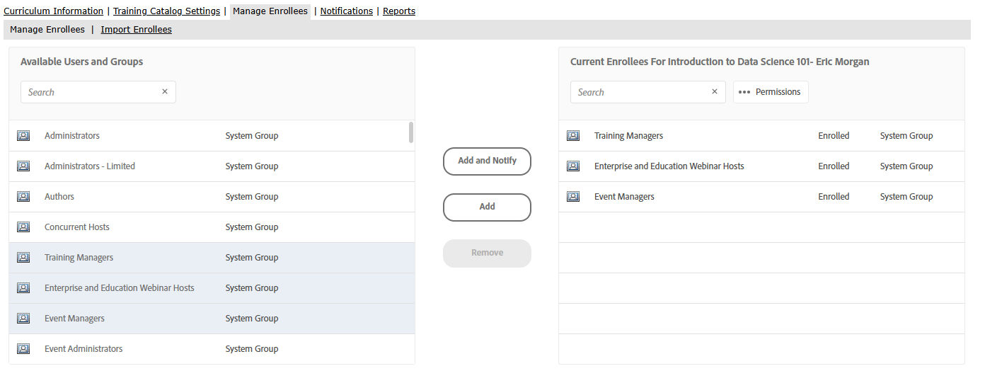 After you’ve added enrollees to a curriculum, you can determine permissions for enrolled users and groups.