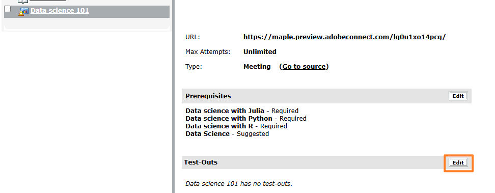 After creating a curriculum, you can make many changes such as assigning prerequisites, assigning test-outs, and editing completion requirements. Adobe recommends using either test-outs or prerequisites, but not both, to create learning paths. Using both is possible, but it can be time-consuming and complicated to test all of the possible workflows learners may encounter.