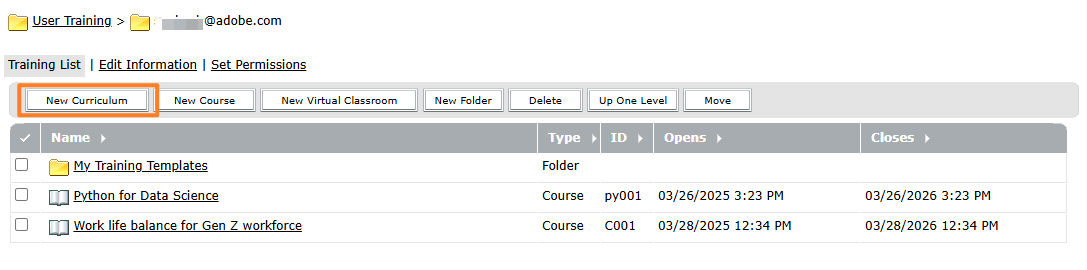 Select Training on the Adobe Connect Central home and then select New Curriculum.