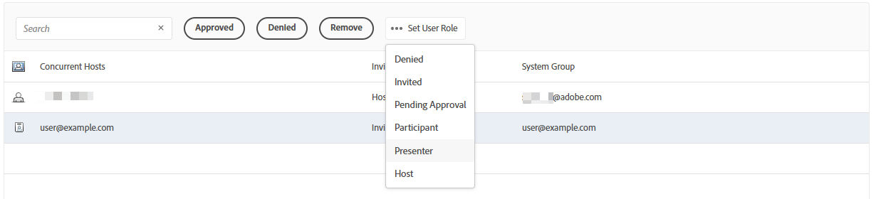 3. From the pop‑up menu, select the new permission type to assign. The permission types are: Denied, Invited, Pending Approval, Participant, Presenter, and Host.