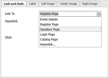 - Link To: A dropdown menu to select the type of link action for the component (typically a button or image). The options are Register Page, Event Details, Speakers Page, and others.