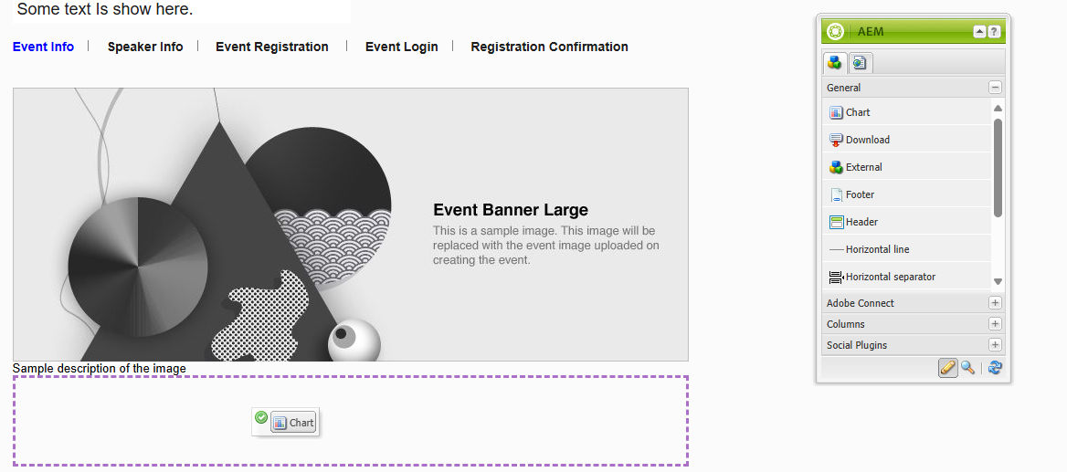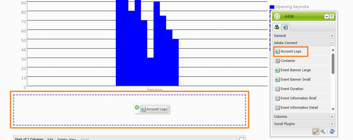 - Add reusable AEM components such as charts, columns, images, and social plugins.