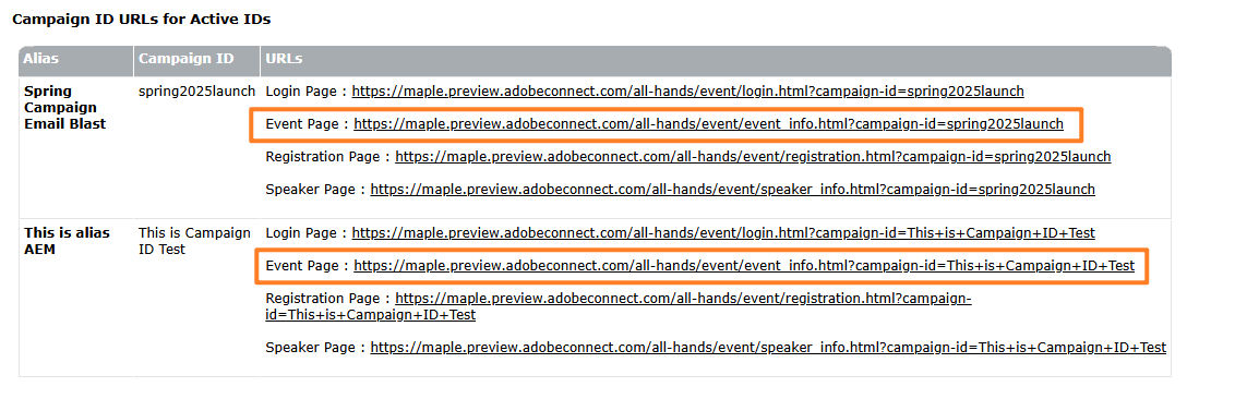 - Campaign ID: A unique identifier for your campaign (for example, spring2025launch, emailpromo1, or linkedin_promo01). This ID is appended to event URLs to track the source of traffic or registrants, for example, https://yourevent.adobeconnect.com/register?campaign=EMAIL_PROMO_1