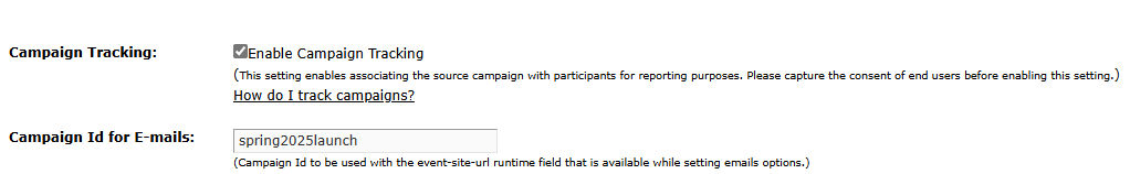 Select Enable Campaign Tracking if not already selected. By default, the Enable Campaign Tracking option is selected on the Campaign IDs page when creating an event. You can also select this tracking option after publishing the event and sending out invitations.
