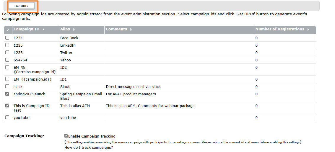 Select one or more campaign IDs and select Get URLs.