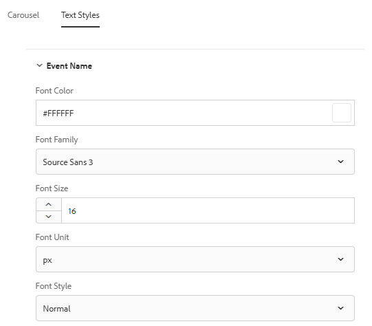 Change the text style of the event, like font color, size, family, or weight. The options you choose reflect on the carousel.
