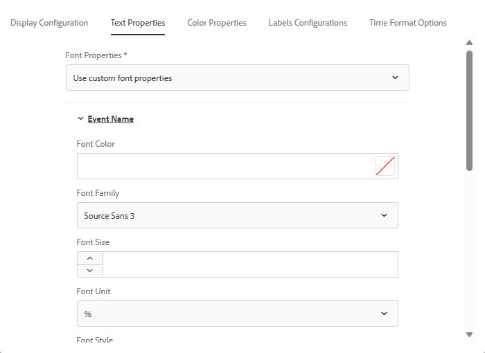 Display configuration interface Display configuration interface - Text Properties: Change the font color, weight, size, or family of the text that appears on the event cards.
