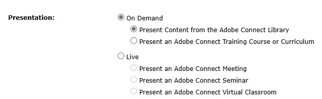 Select On Demand as the presentation type. View How to create an event for more information on creating an event in Adobe Connect.