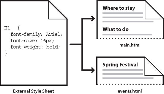 يوجد النمط (المستمد من قاعدة، أو مجموعة من القواعد) في مكان منفصل عن النص الفعلي الذي يتم تنسيقه بناءً على هذا النمط، وعادةً ما يوجد في ورقة أنماط خارجية، أو في جزء العنوان لمستند HTML. ومن ثم، يمكن أن تنطبق قاعدة واحدة لعلامات h1 على العديد من العلامات مرة واحدة (وفي حالة أوراق الأنماط الخارجية، يمكن أن تنطبق القاعدة على العديد من العلامات مرة واحدة بصفحات متعددة). وبذلك، توفر CSS إمكانية تحديث فائقة السهولة. فعند تحديث قاعدة CSS في مكان واحد، يتم تحديث تنسيق جميع العناصر التي تستخدم النمط المعرّف تلقائيًا إلى النمط الجديد.